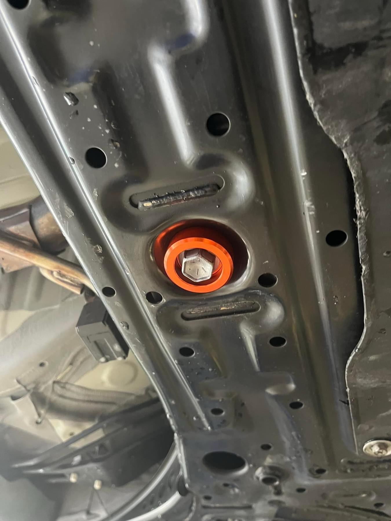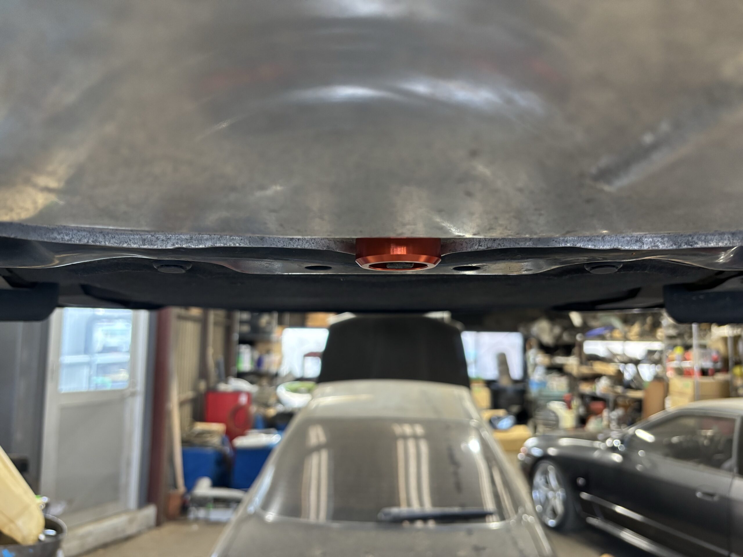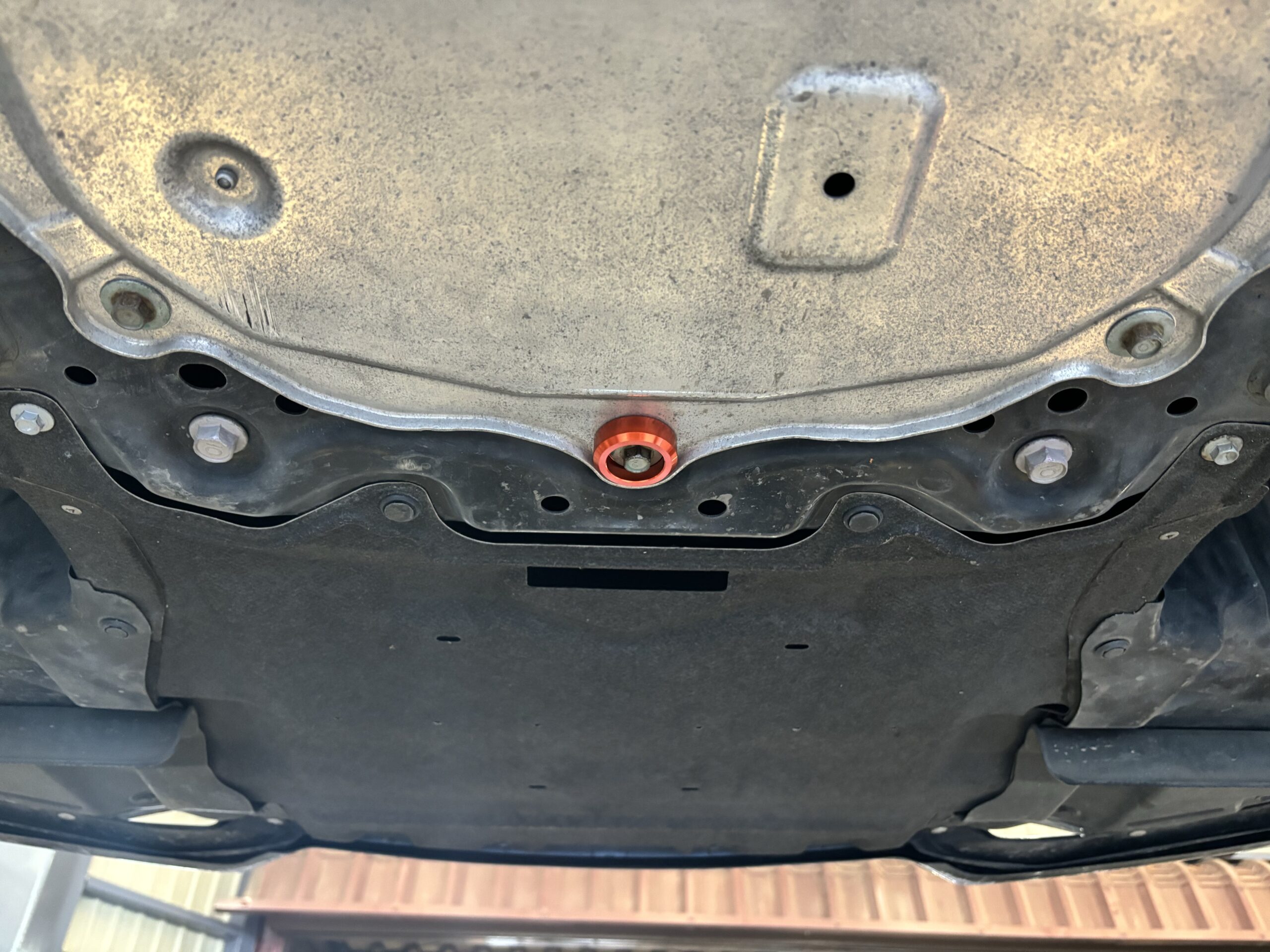 オイルパンの保護プレートを止めるボルトに挟み込むだけ。