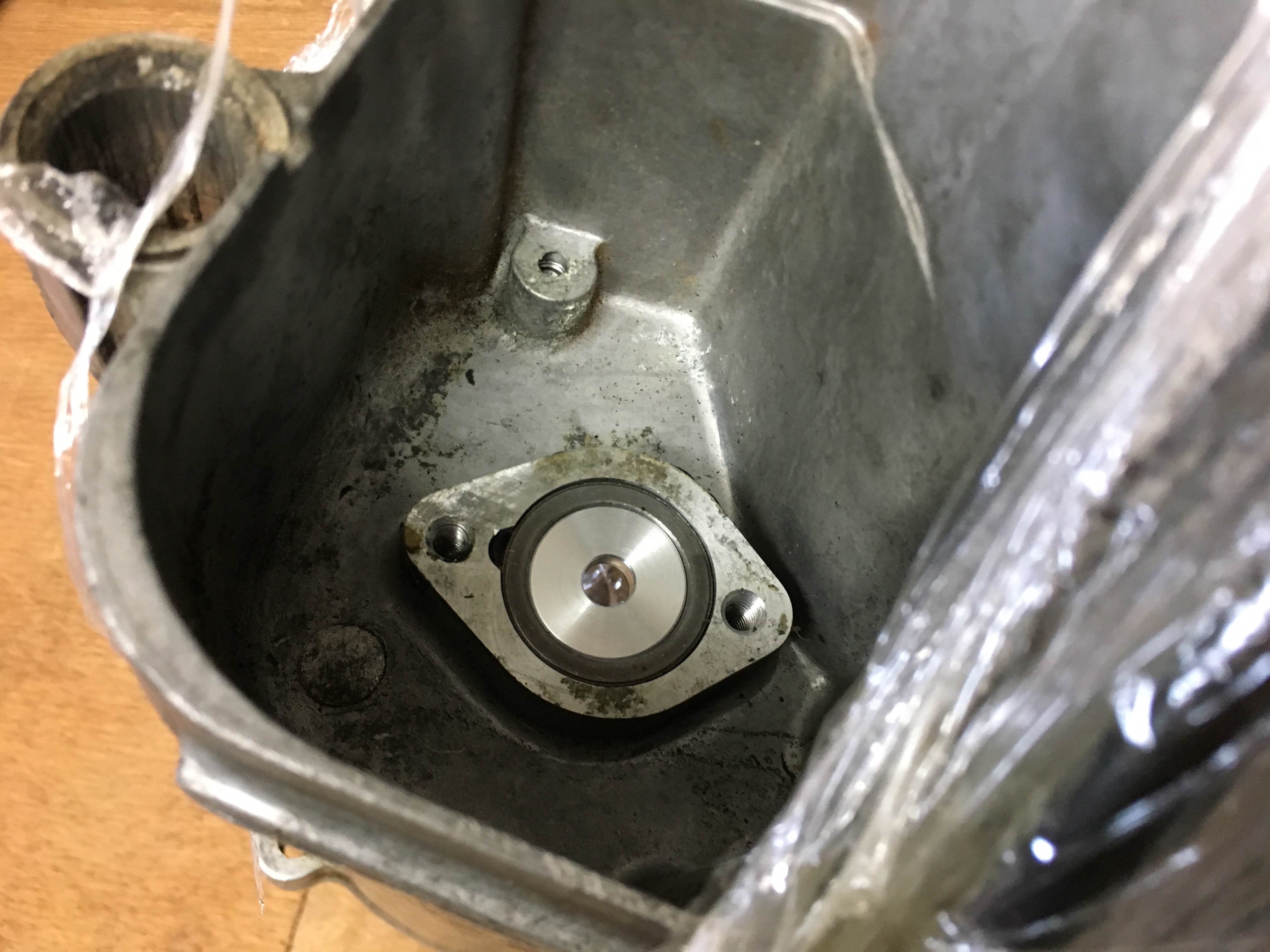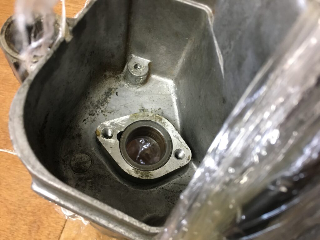 写真のケースは、ミッションが抜いてありますが、本来ならここにはオイルポンプギアの裏側が見えます。